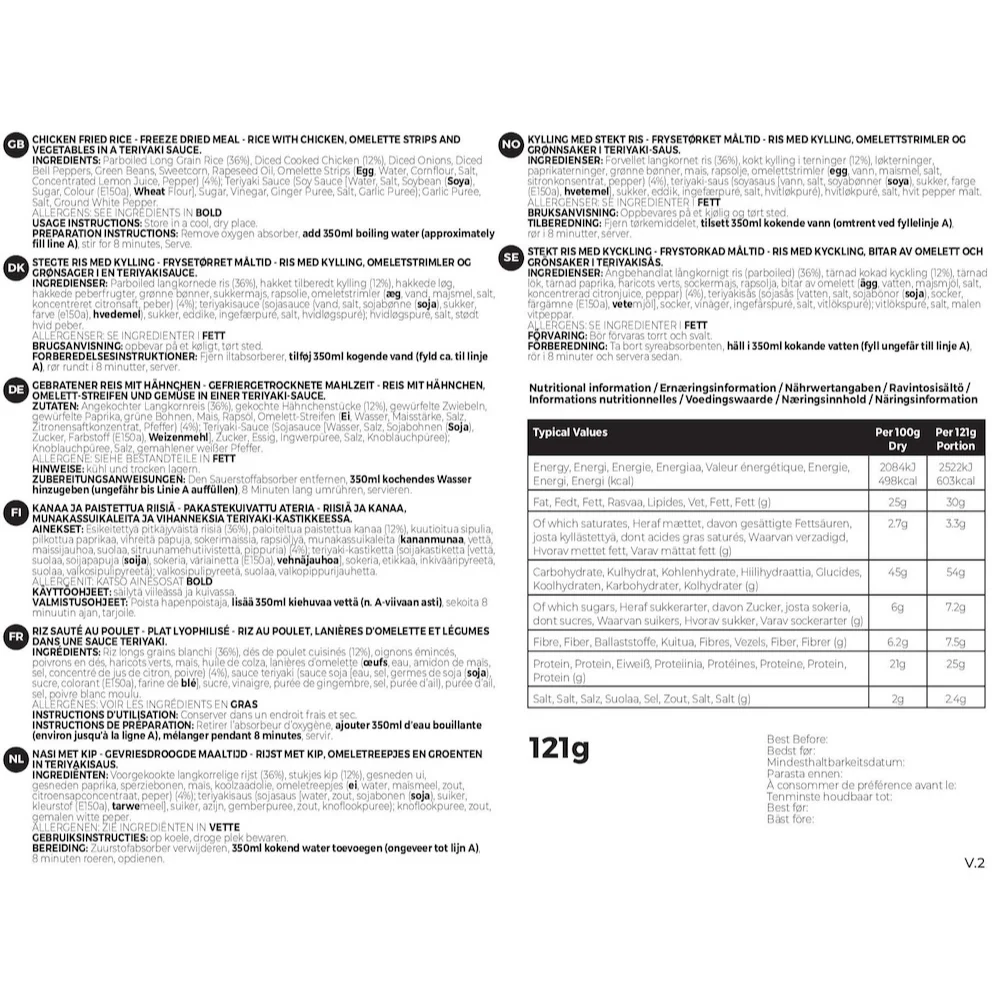 - Przed użyciem sprawdź skład, aby uniknąć reakcji alergicznej. Posiłki mogą być gorące po zalaniu wodą, zachowaj ostrożność, aby się nie oparzyć. Przechowuj w suchym, chłodnym miejscu, z dala od dzieci. Spożywaj zgodnie z instrukcją producenta. Nie używaj przeterminowanych produktów. Opakowanie i resztki należy utylizować zgodnie z lokalnymi przepisami.