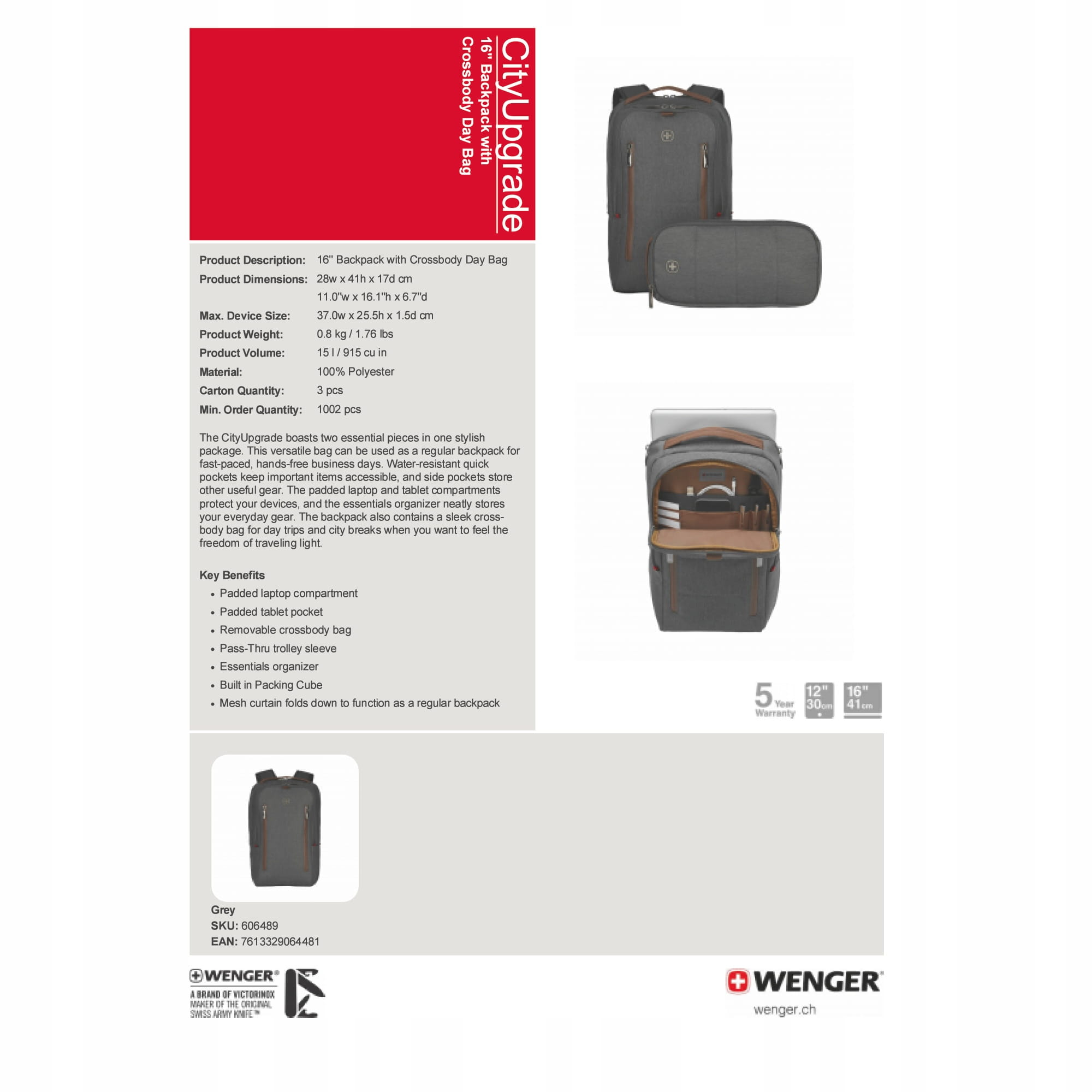 Plecak City Upgrade 16" 606489 szwajcarskiej marki Wenger, na laptopa 16 cali z dodatkową torbą przewieszaną przez ramię