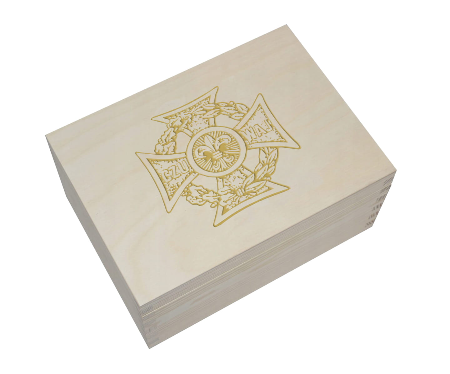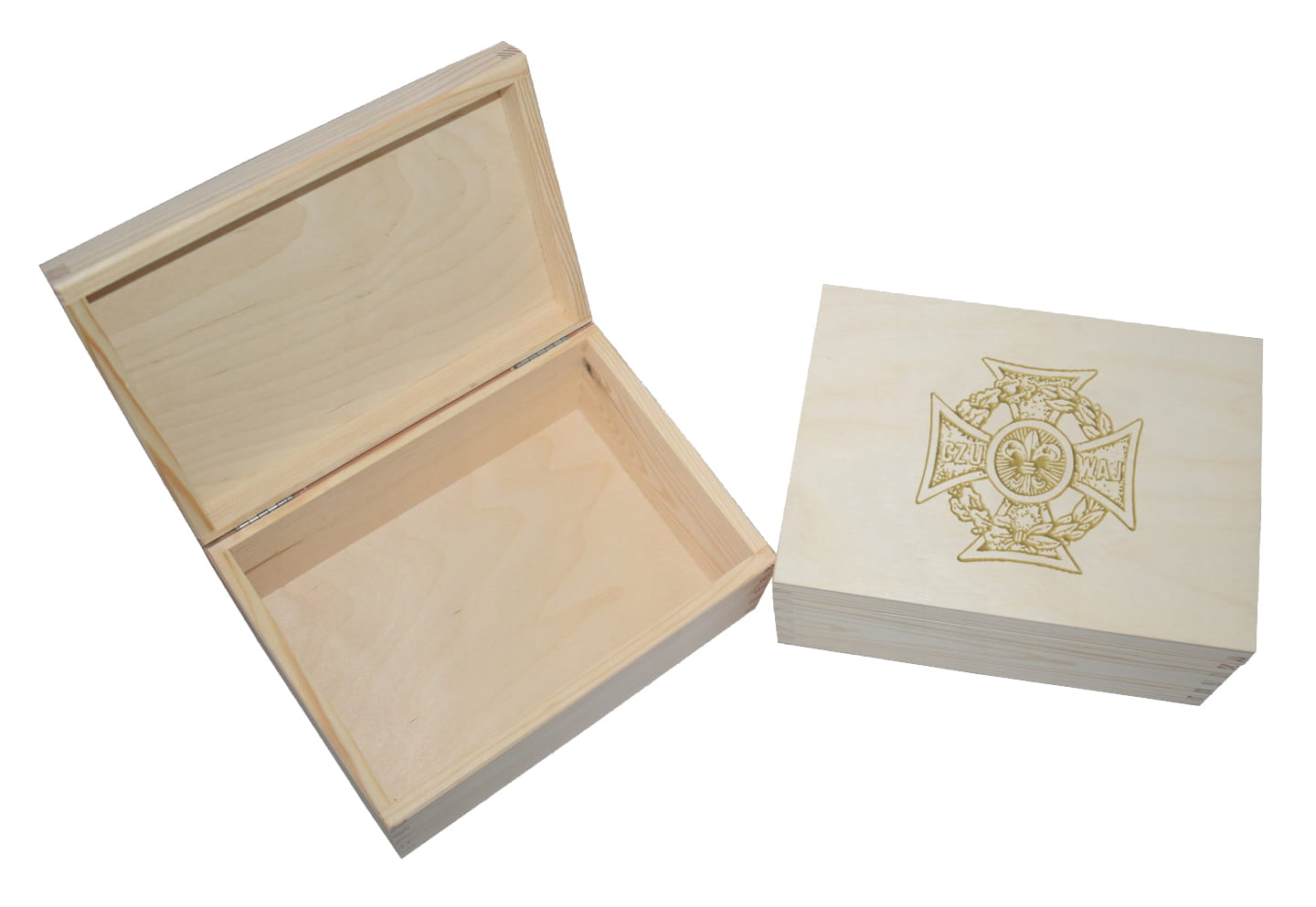 Drewniane pudełko na harcerskie i zuchowe skarby i wspomnienia. Na wieku pudełka wygrawerowany jest krzyż harcerski Świetny pomysł na urodzinowy prezent albo pamiątkę złożenia Przyrzeczenia Harcerskiego.