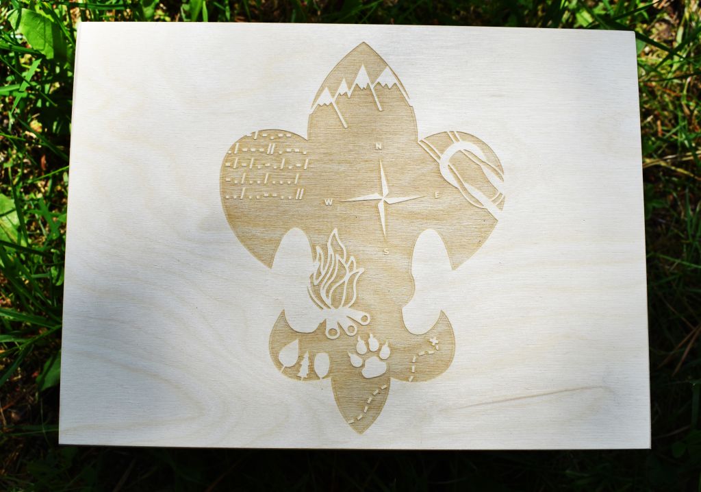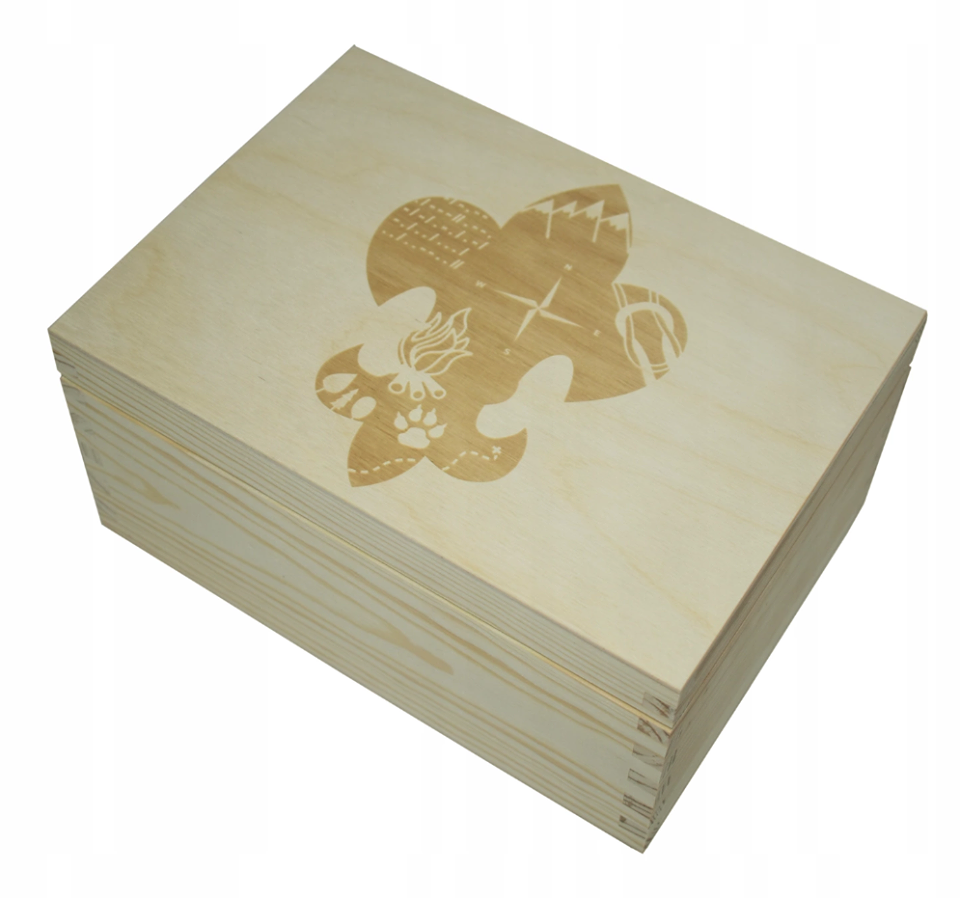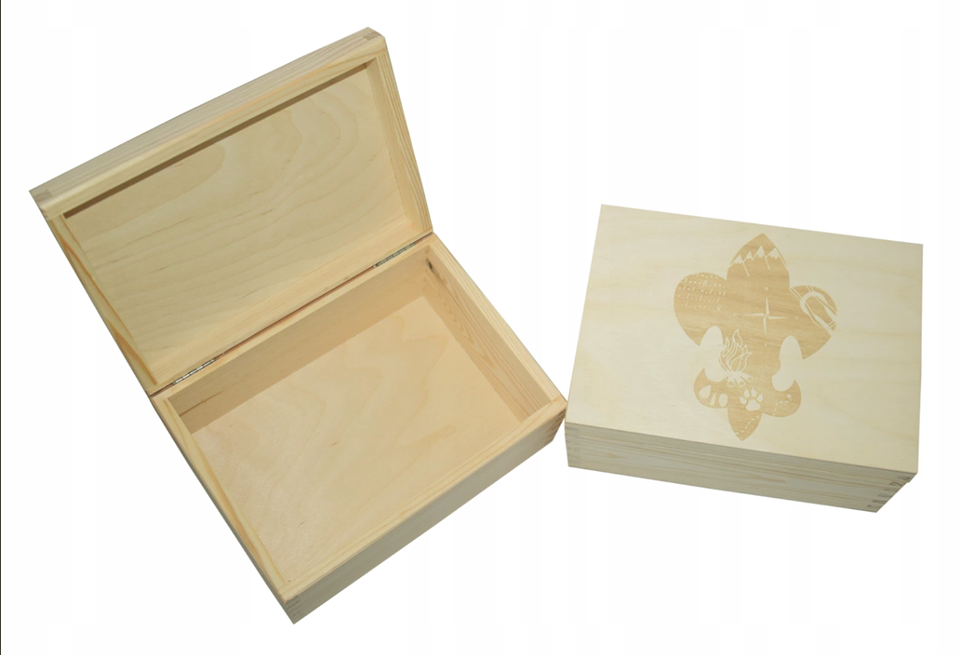 Drewniane pudełko na harcerskie i zuchowe skarby i wspomnienia. Na wieku pudełka wygrawerowana jest lilijka z harcerskimi symbolami (ognisko, róża wiatrów, węzeł przyjaźni, alfabet morse'a, łapy wilka, las, góry). Świetny pomysł na urodzinowy prezent albo pamiątkę złożenia Zobowiązania Instruktorskiego.