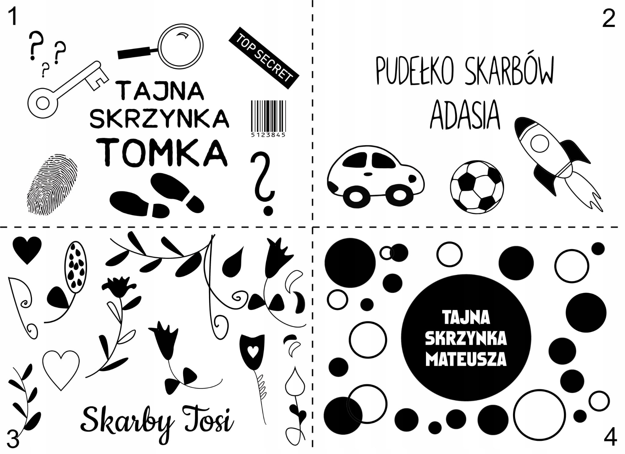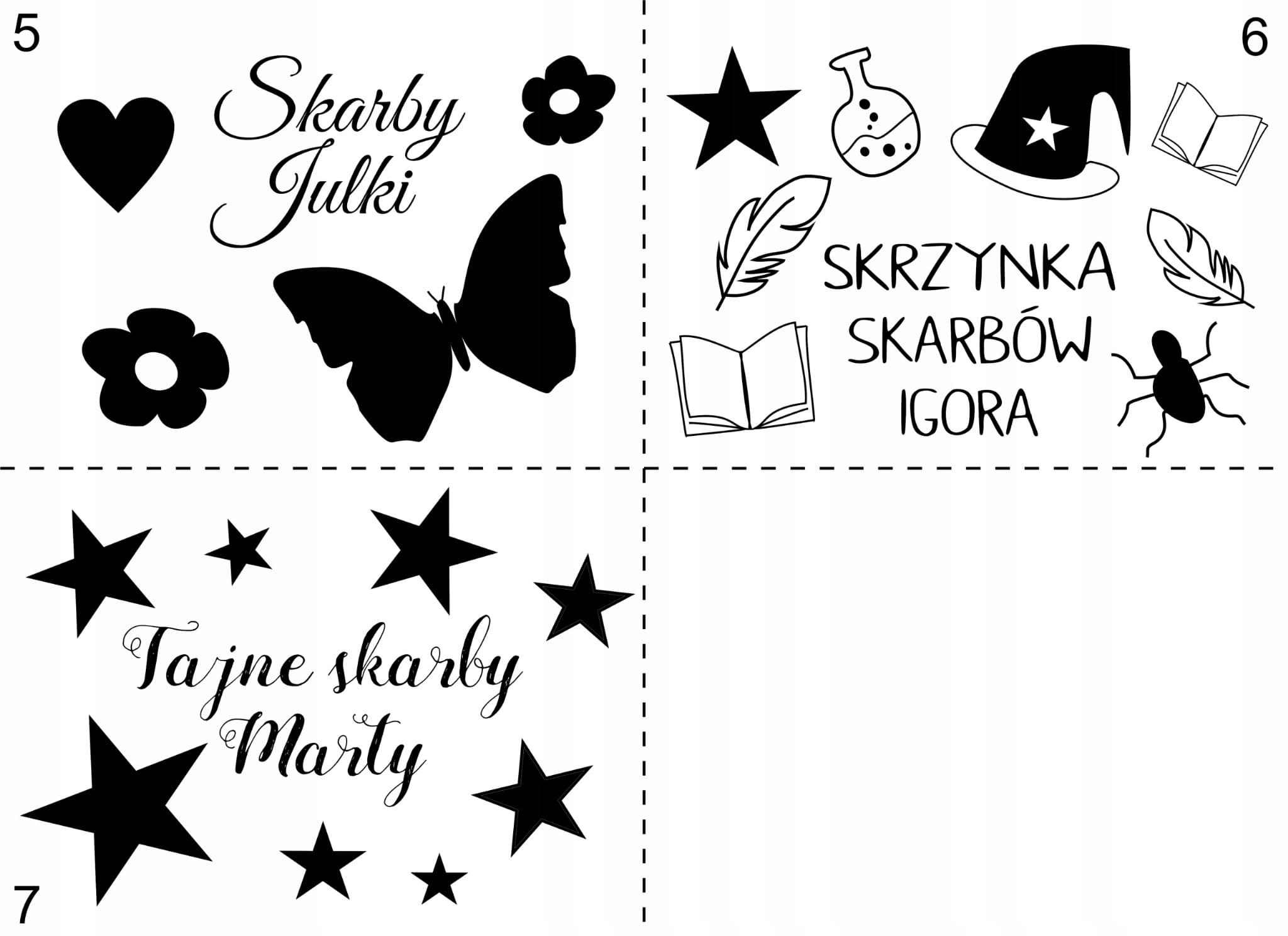 - napis na skrzynce - dowolny (np. tajna skrzynka Kasi, pudełko skarbów Jasia, 5 urodziny Zosi itp.)